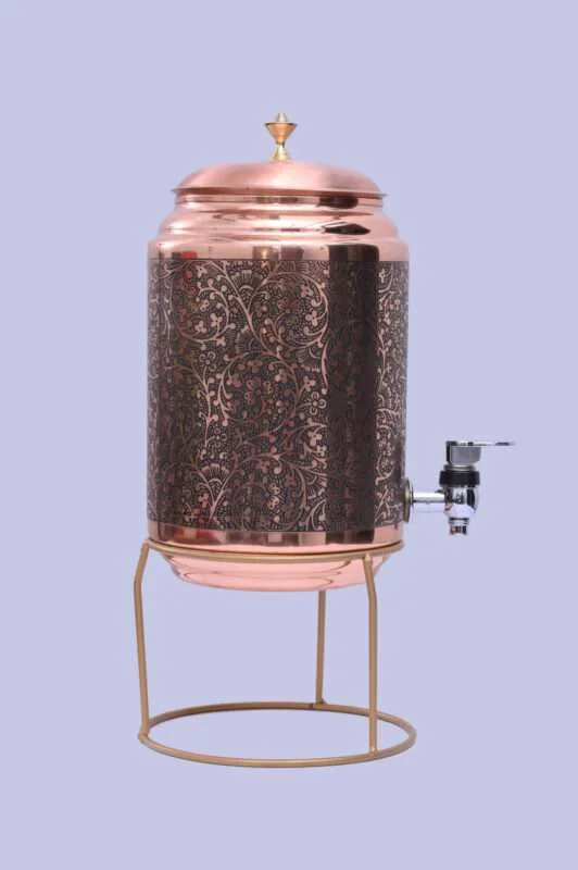 Curearth Pure Copper Antique Etching Water Pot , Pure Copper 5Ltr Water tanki & free stand
