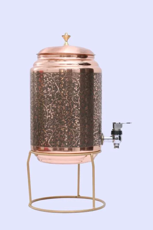 Curearth Pure Copper Mirror Etching Water Pot | Classic pure copper water 5Ltr. Tanki & amp; Stand